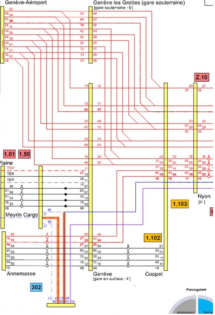 - à Cornavin une gare souterraine de 420 m de long comprenant un quai et deux voies que les trains empruntent tousempruntées par les trains toutes les deux dans le même sens, d’est en ouest,