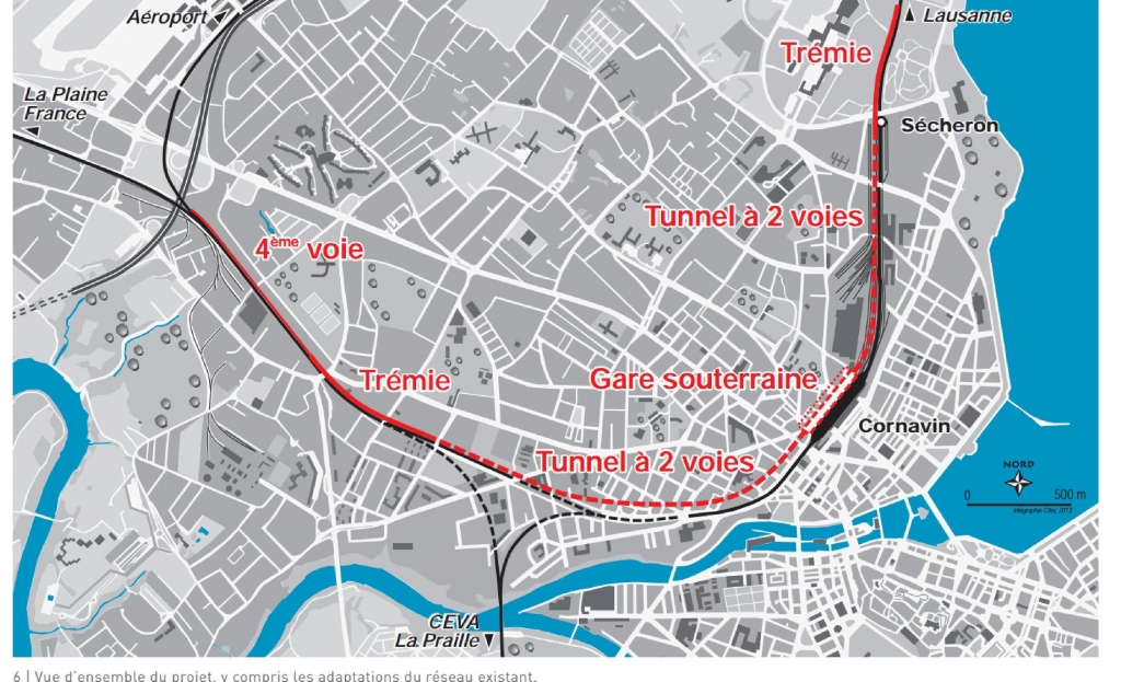La première phase de la solution adoptée par les autorités, les administrations et les CFF pour augmenter l’insuffisante capacité du nœud de Genève comprendrait un tronçon nouveau d’environ 5 kilomètres. souterrain, qui relierait le Jardin botanique au Viaduc de l'Ecu avant un second tronçon en surface d'une voie seulement ajoutée aux trois voies actuelles jusqu'à la bifurcation où se sépare la ligne de l'aéroport.